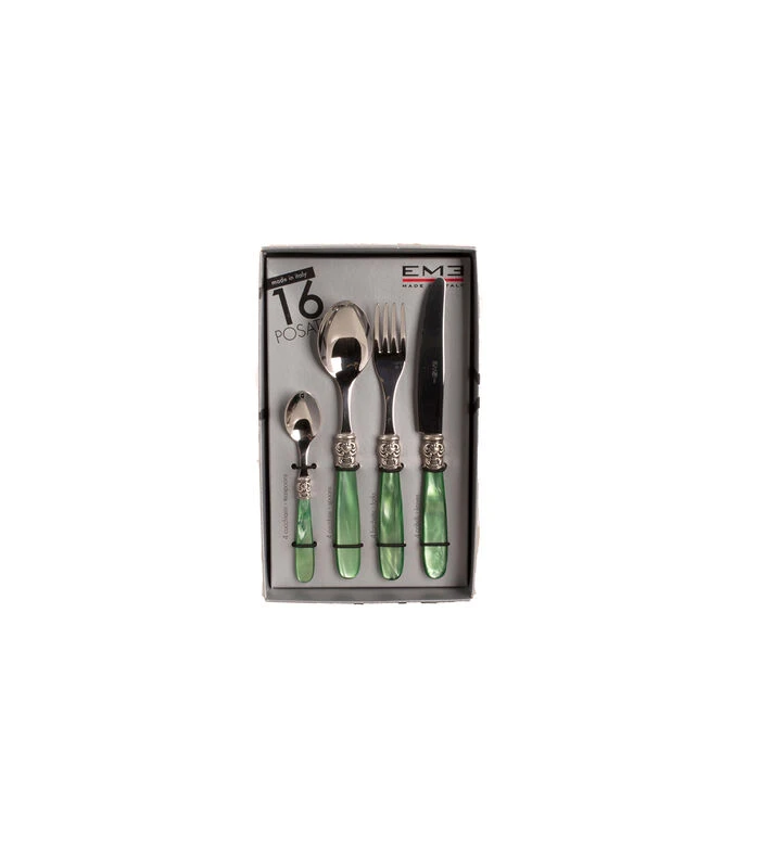 Deze EME Mona Lisa bestekset is ontwikkeld voor de liefhebber van bestek van Italiaanse hoogwaardige kwaliteit en een eigentijdse afwerking. Traditioneel en modern is in deze bestekset samen gebracht, waarbij het bestek licht in gewicht is. Deze serie kenmerkt zich door een uitstekende balans in dikte van het handvat en het lange, elegante lemmet. Deze prachtige 16–delige bestekset bestaat uit 4 tafelvorken, 4 tafelmessen, 4 tafellepels en 4 koffielepels. Ieder item is gemaakt 18/10 roestvrij staal en heeft een acryl groen handvat.