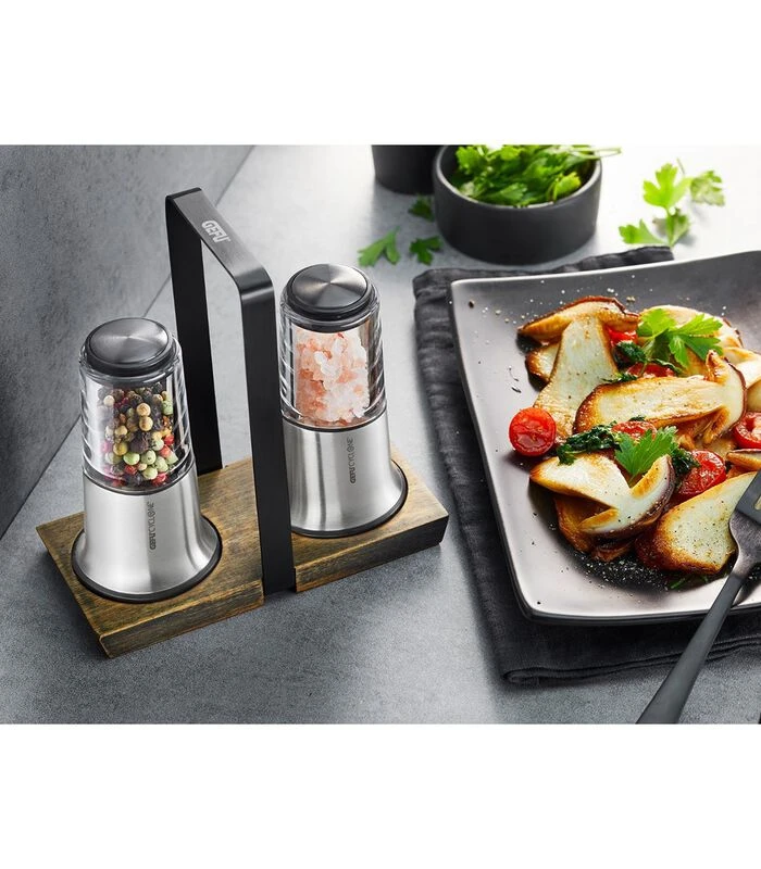 Zo mooi kan het kruiden zijn: de exclusieve set is een echt highlight voor een stijlvolle thuis van de dag van vandaag. Beide molens zijn uitgerust met de uiterst efficiënte CYCLONE® precisie–maalinrichting die steeds voor de perfecte maalgraad zorgt – van extra fijn tot extra ruw. Met een X–PLOSION® laten peper en zout hun volle, natuurlijke smaak tot ontwikkeling komen. Gecompleteerd wordt de set door een houten menage met praktische draaggreep. Het ideale geschenk zelf voor verwende kookkunstenaars.
