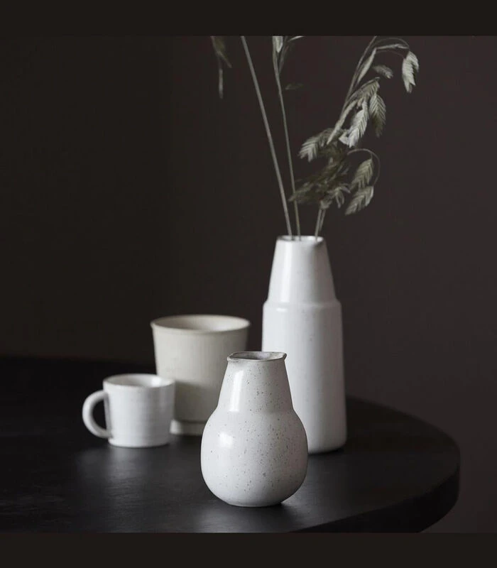 Met een klein potje voor melk, room of saladedressing maakt u uw tafeldecoratie helemaal af. Dit kleine porseleinen flesje van House Doctor wordt gepresenteerd in een wit gespikkelde coating die het een esthetisch tintje geeft. Gebruik hem als melkopschieter voor uw middagthee en koffie, of voor saus. Deze fles past perfect bij de rest van de Pion set of bij serviesgoed in even lichte tinten. Door de matte textuur van het glazuur kunnen er geleidelijk krassen ontstaan tijdens het gebruik van uw Pion voorwerp. Dit voegt gewoon charme en kracht toe aan het ontwerp.