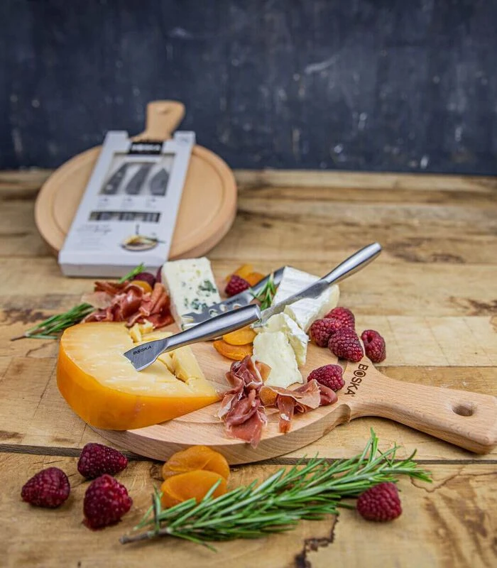 Met de Kaasset Amigo van BOSKA heb je alles in huis om een heerlijk kaasplankje te serveren. De set bevat een rustiek beukenhouten plank en drie kleine, lichtgewicht kaasmessen. Met deze messen krijg je elk type kaas klein krijgt. De kaasmessen