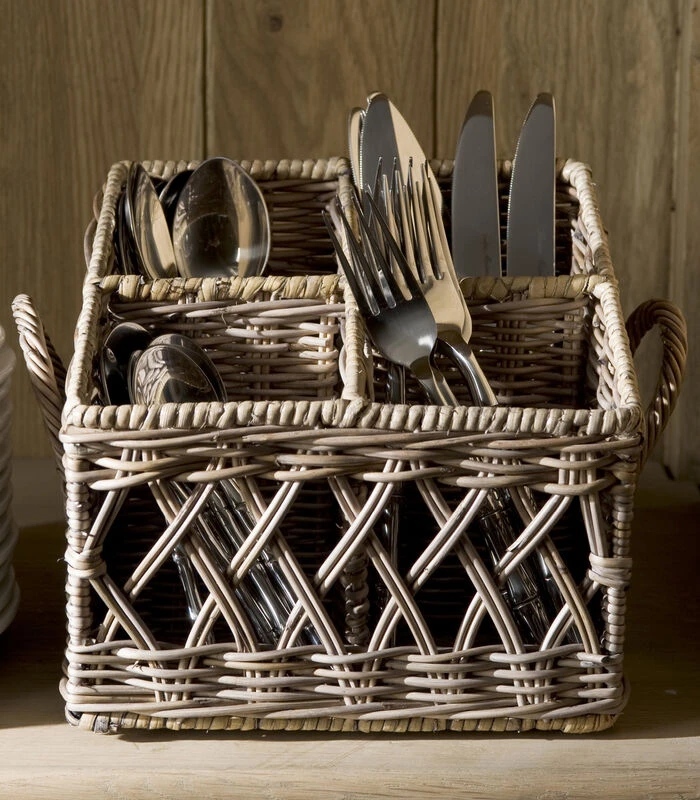 Een handige bestekbak van vergrijsd riet waarin u gemakkelijk de vorken, messen en lepels kunt scheiden.