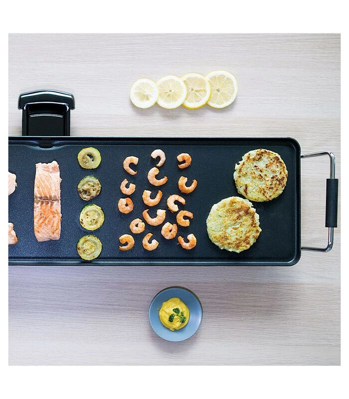 Elektrische Teppan Yaki. Groot grilloppervlak 90 x 23 cm. Anti–aanbaklaag. Koele aanraakgreep. Verwijderbaar vet–/olielekbakje. Regelbare thermostaat. Eenvoudig schoon te maken. Antislipvoetjes.