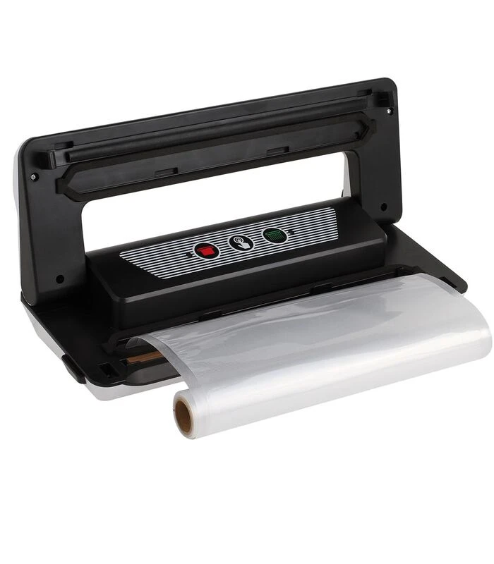 Vacumeerapparaat Voor een luchtdichte verpakking voor alle soorten levensmiddelen Automatische luchtlediging Bedieningspaneel met 3 functies: sluiten, vacuüm trekken en sluiten stoppen Bedieningslampjes Rollenlade en geïntegreerd snijmes aan de achterkant Afdichtingsbreedte van 2 mm Geschikt voor plastic folie met een maximale lengte van 28 cm Folierol van 3 meter inbegrepen Geschikt voor het koken en invriezen van vacuümverpakte producten Snoeropbergmogelijkheid Antislipvoetjes