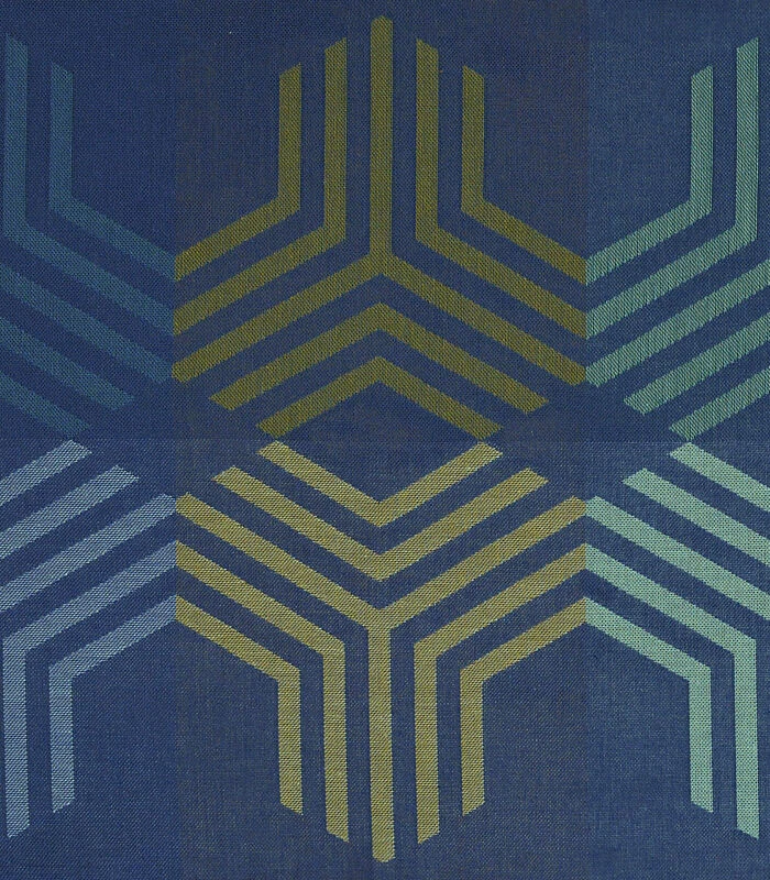 Een hypnotiserend spiegeleffect onthult een jaren 70 inspiratie voor spannende tafels. Aan weerszijden van de tafel versmelt een variatie van blauwtinten met groentinten, terwijl een levendige pruim met rood– en fuchsiatinten in het patroon versmelt.